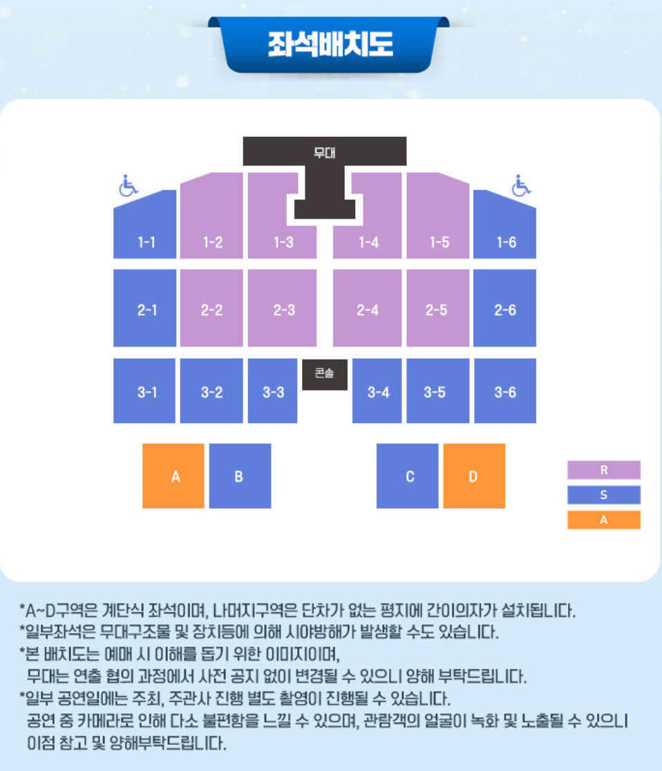 좌석 배치도 정보가 제일 중요하겠죠? A석은 얼마 없네요 S석과 R석으로 가득차군요 1-3과 1-4 핫한 자리로 예상되네요 편하게 보려면 2-3이나 2-4도 좋을거 같구요 그리고 코로나로인해 좌석은 한칸씩 떨어져서 좌석간 거리두기를 한다고 합니다. 참고하세요