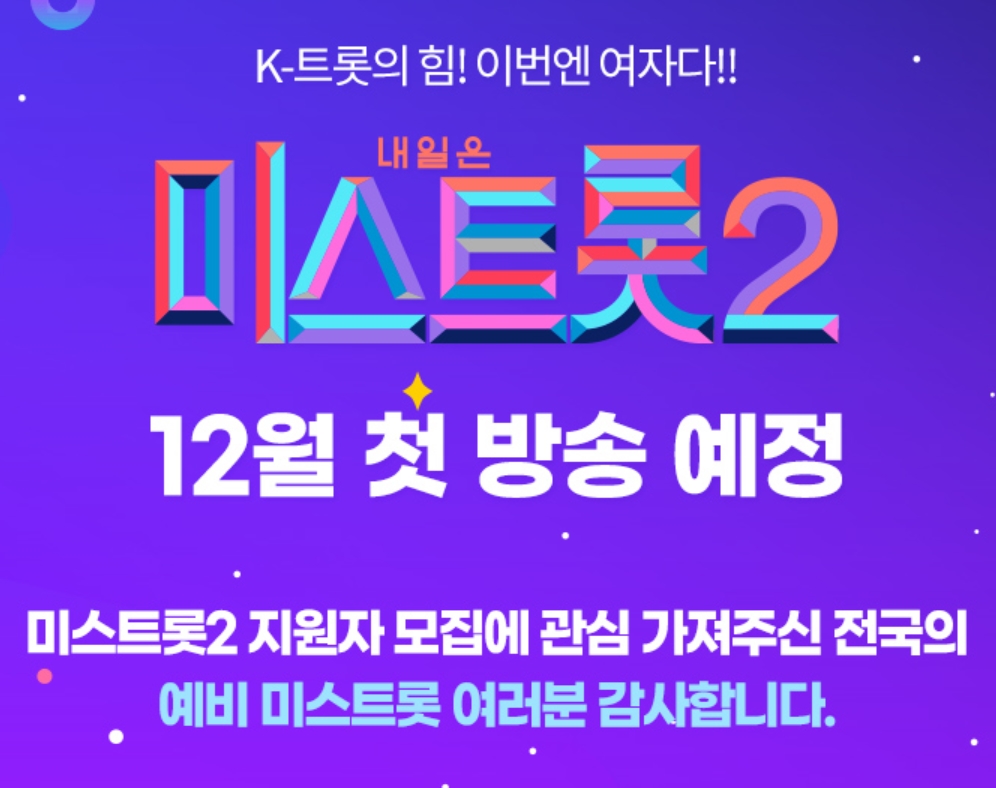 미스터트롯이 엄청난 인기를 끌며 미스트롯2가 제작되었죠 현재 예심이 다끝나고 12월에 방송예정이라고 합니다.