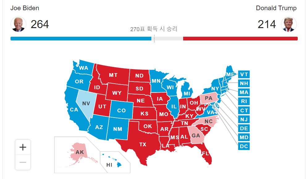 매직넘버 270에 가까워진 바이든 5일 AFP통신에 따르면 미국 대선 개표가 진행 중인 가운데 바이든 후보가 선거인단 264명을 확보해 당선에 필요한 매직넘버(270명)에 근접했다.